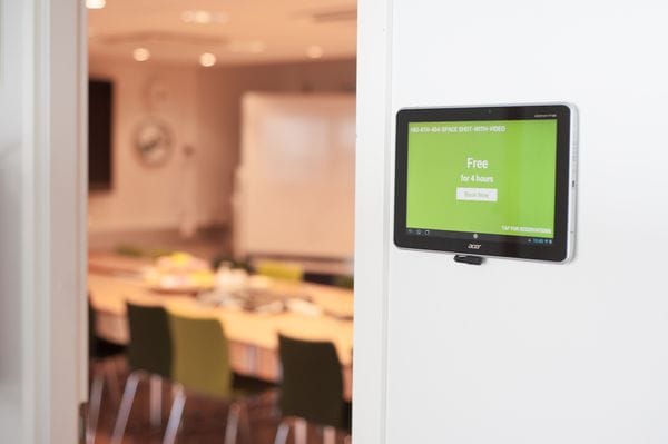 Reservator uses your Google calendar’s resources for the conference rooms. The application displays the bookings of the room it is located at, but you can also use it to book other rooms.  It will also display whether the room is available or not, as seen in the picture above. While using Reservator, you can still book rooms normally through Google Calendar. For the setup of this application you only need to sync your tablet with a Google account that has resources available and select the correct room in the application.