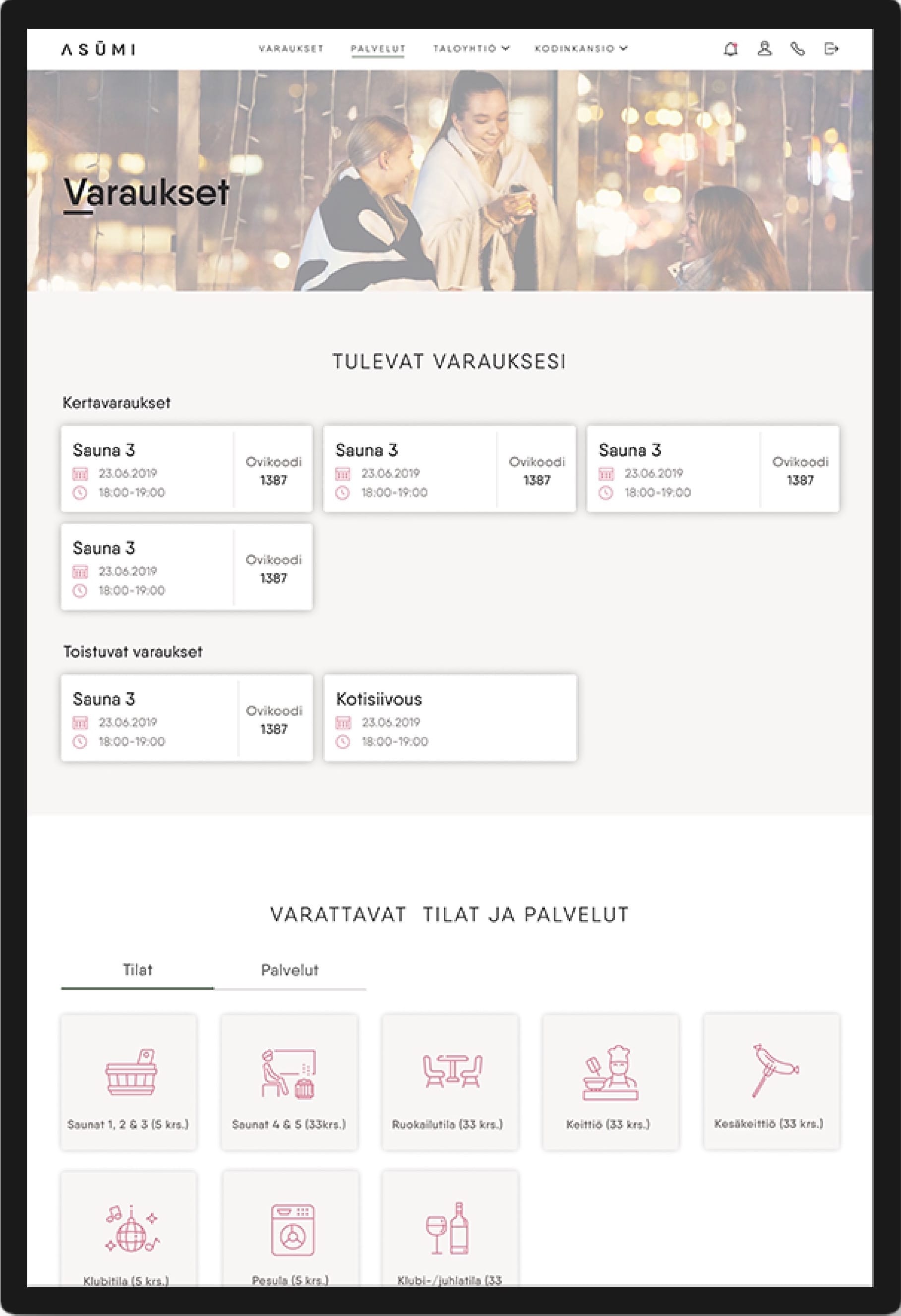 Futurice and Columbia Road created Asumi, a new brand for SRV and web-based service platform for the tower building residents. The service can be used on a smartphone, tablet or computer. It allows users to book and use the facilities, such as saunas, party premises as well as catering. It also provides access to daily services like cleaners and maintenance staff with just a few clicks. Residents can also contact lobby services, read current newsletters and emergency plans, and submit service requests or other announcements.